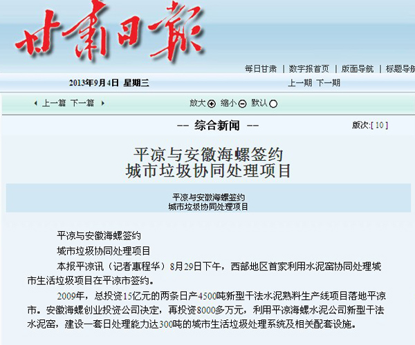 In 2009, two 5000t/d output cement production lines with a total investment of 1.5 billion rmb were constructed in Pingliang city. Anhui conch venture decided to invest more than 80 million rmb to construct one set of 300t/d capacity municipal garbage treatment system and its auxiliary facilities.